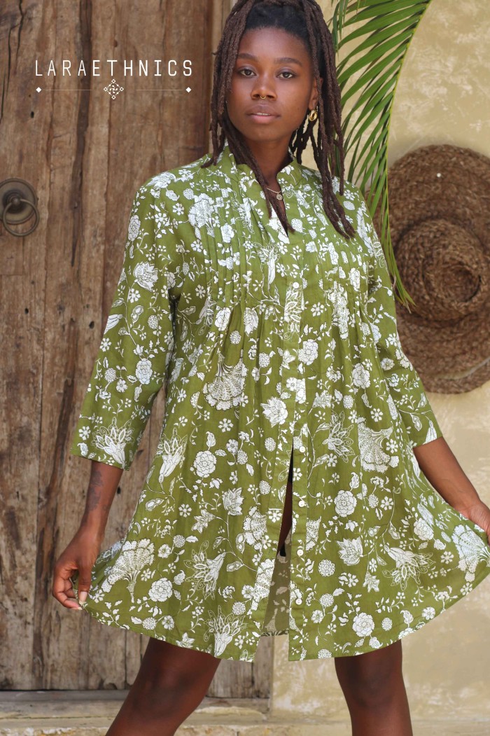 Chemise fluide mi-longue entièrement boutonnée, avec manches 3/4 et col mao. Détail de poitrine plissée pour une touche raffinée.
