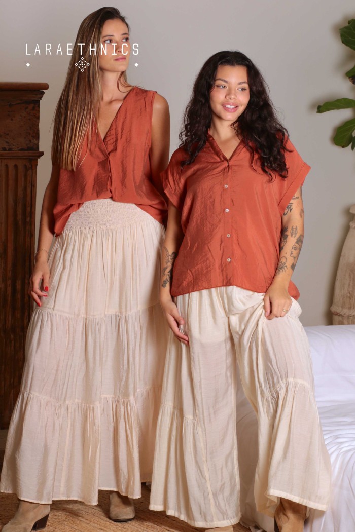 Débardeur fluide avec une coupe évasée et un col V. Son bas arrondi ajoute une touche de douceur et de modernité.